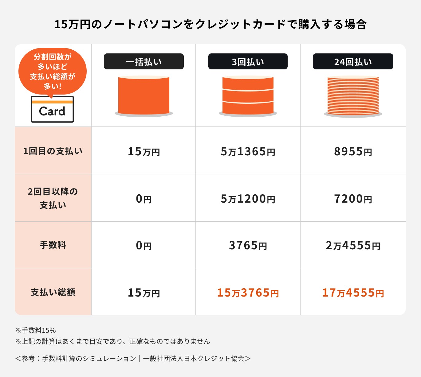 ②分割払いやリボ払いには手数料がかかる