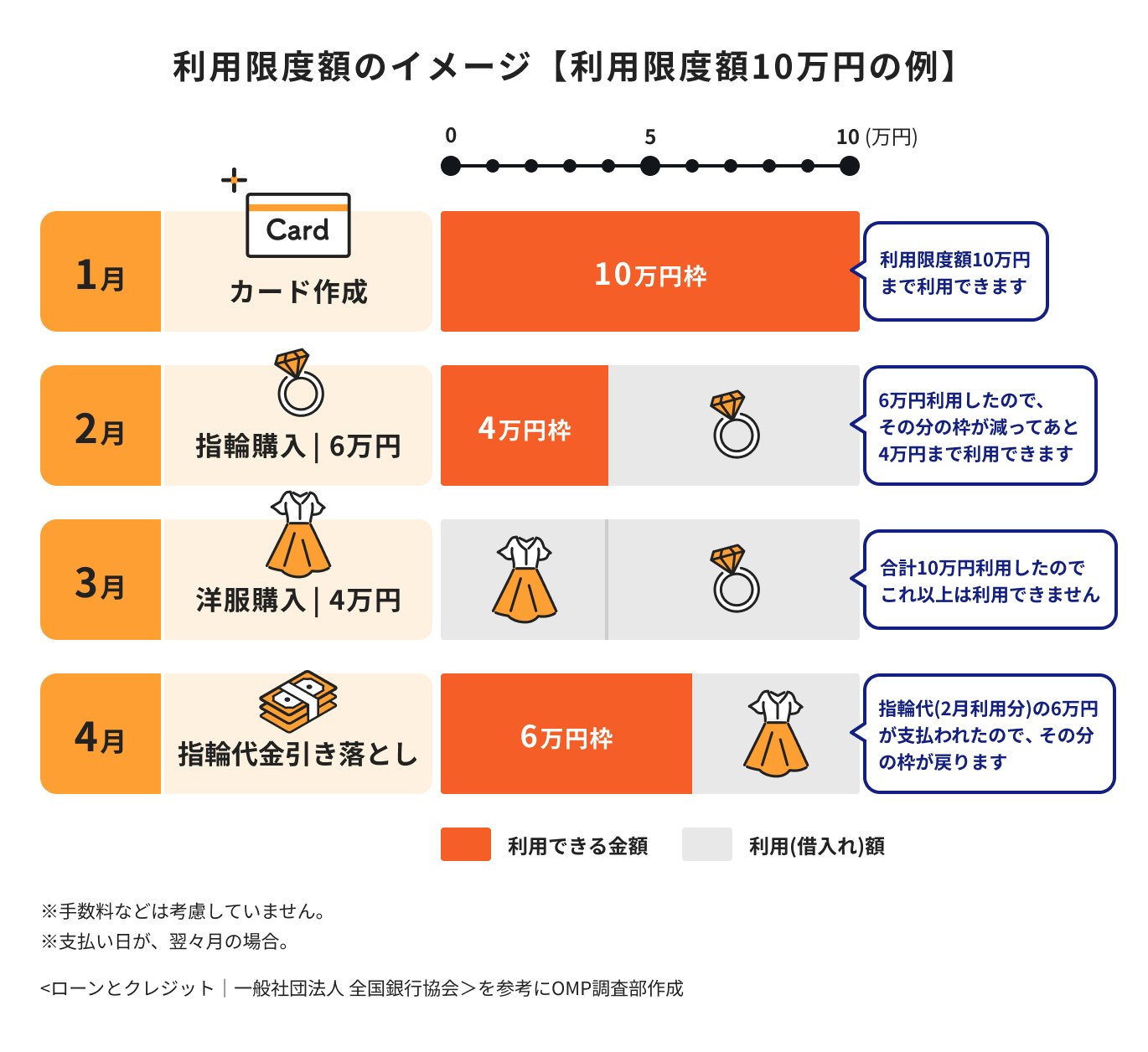 クレジットカードには利用限度額が設定されており、その範囲内であれば何度でも利用が可能です。