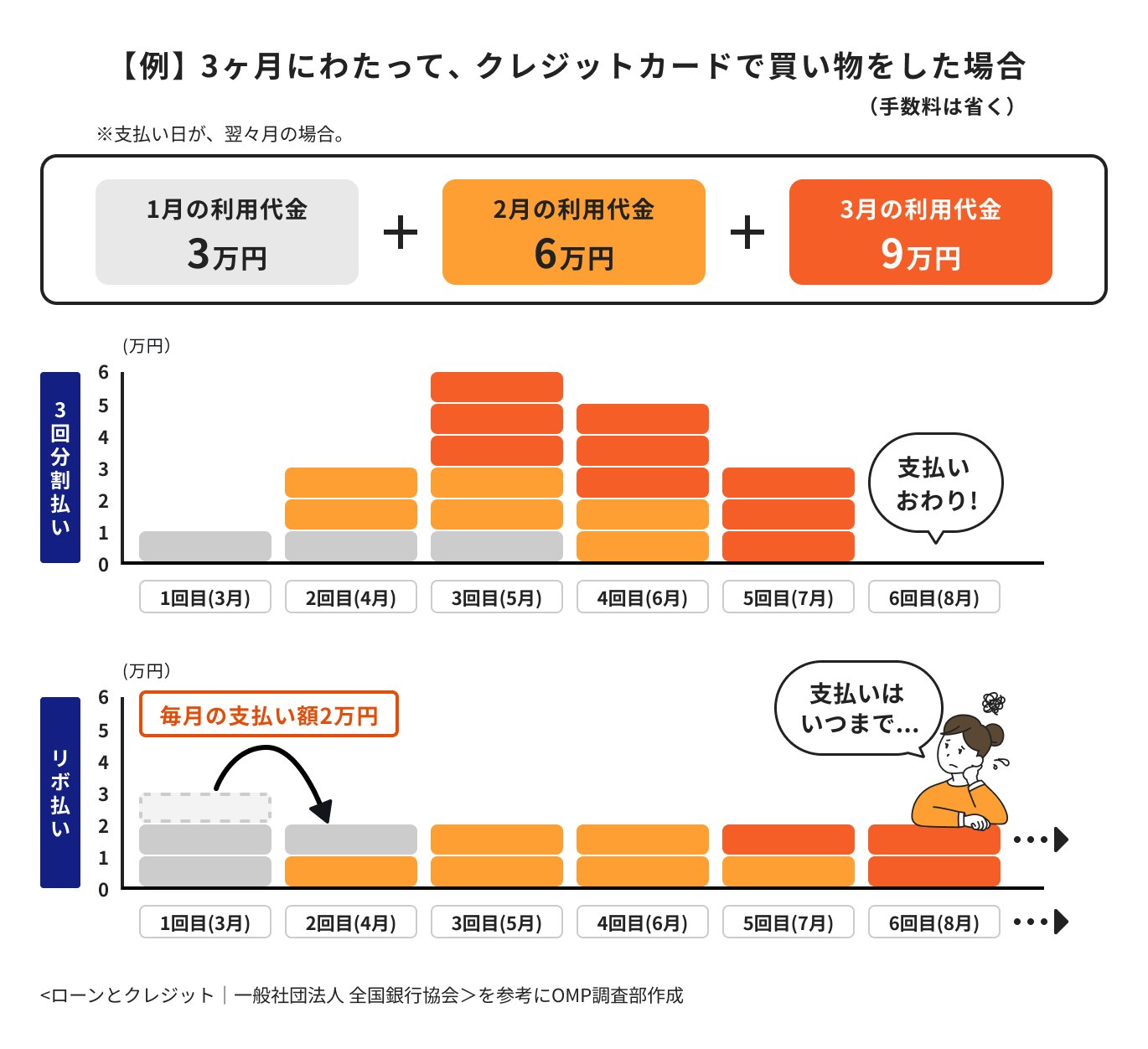 毎回の支払額を抑えられるからといって、分割払いやリボ払いの利用を重ねると、いずれは支払いが困難な状況になりかねないため、計画的に利用することが大切です。