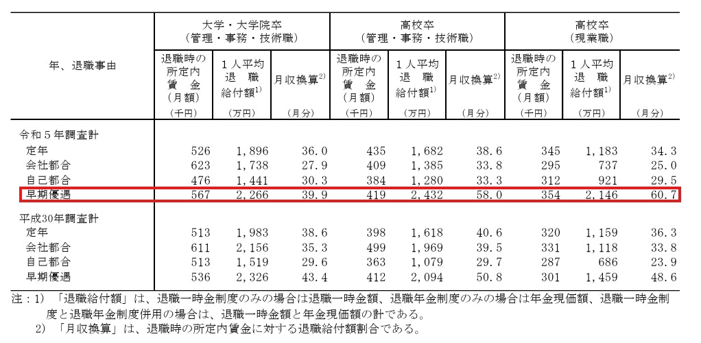 厚生労働省「就労条件総合調査」の退職給付制度の状況を参照すると、早期退職優遇制度などを利用した場合の退職給付額は、定年退職の場合に比べて上乗せされる傾向があることがわかります。