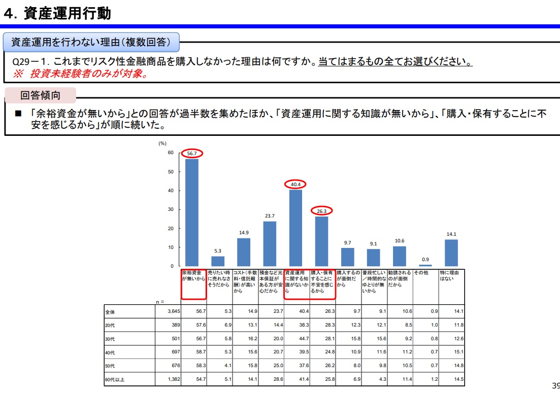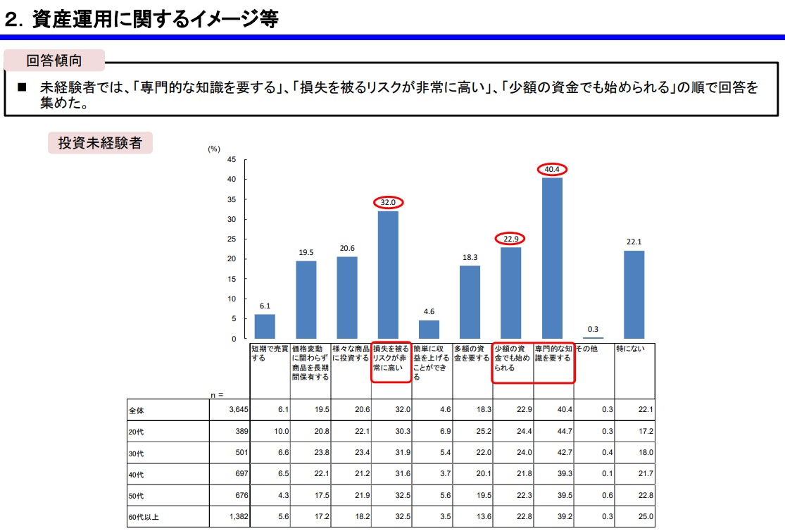 金融庁の調査によると、投資未経験者が資産運用に抱くイメージとして「専門的な知識が必要」(40.4%)、「損失リスクが非常に高い」(32.0%)が上位に挙がっており、「始めるハードルが高い」と感じている人が多いことがわかります。