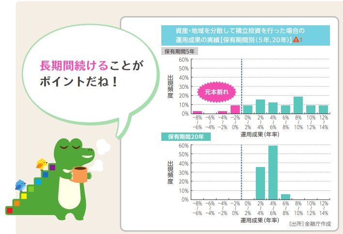 上記の画像は金融庁のデータに基づき、資産・地域を分散して積立投資を続けた場合の運用成果(保有期間別)をシミュレーションしたものです。