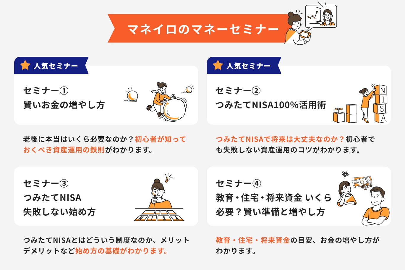 (①と②のマネーセミナーは特に人気が高いものになります)