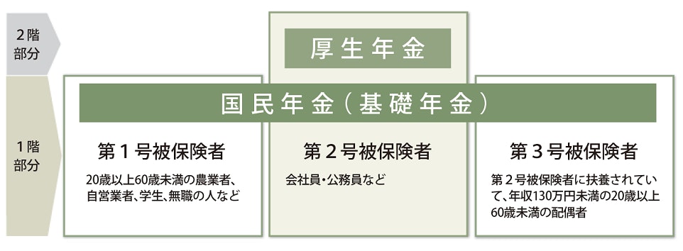 日本の年金制度はすべての国民が加入する国民年金と、会社員などが加入する厚生年金があり、2階建ての仕組みとなっています。