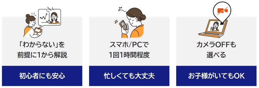 マネイロの債券サポートなら、まったく知識や経験がない状態でも問題ナシ。債券の基本や為替リスクについてもイチから易しく解説いたします。サポートはオンライン&カメラOFFでもOKなので、お気軽にご相談いただけます。