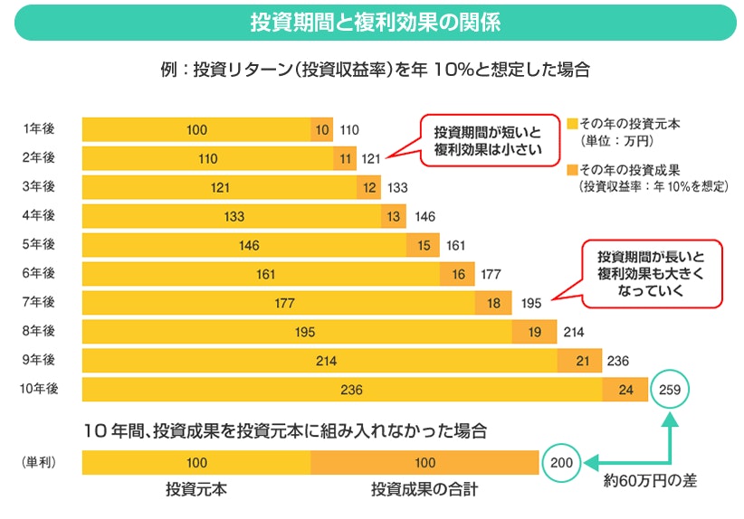 仮に100万円を投資リターン(投資収益率)年10%で複利運用した場合、10年後には259万円に増えている計算です。